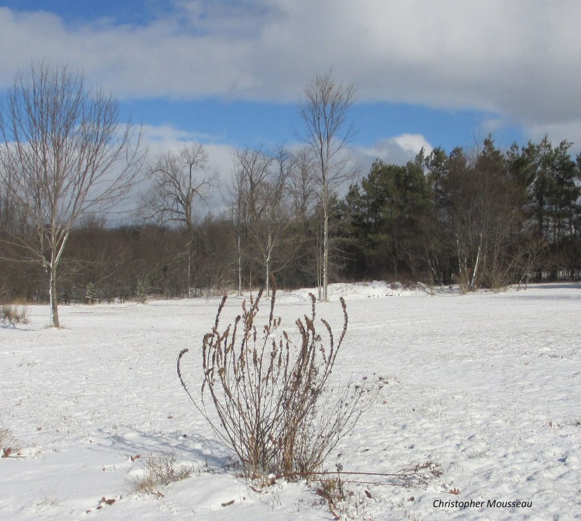 Even in dead of winter some wildflowers (what are often called weeds…) have an entrancing architectural form, such as the Evening Primrose shown above. I love how it echoes the strong vertical lines of the trees in the background and how the stems curve inwards at the top, as if trying to grasp any patches of blue sky it can reach. Goldenrod and Queen Anne’s Lace can’t compare to this Oenothera biennis in the winter, although I do love the form of several more traditional perennials, such as this Sedum, and the tall dead sunflower stalks.