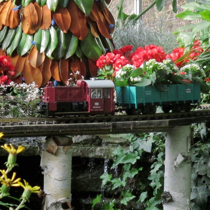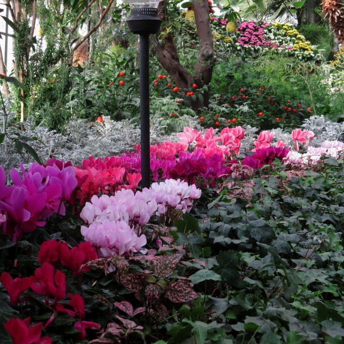 In search of a shot of colour I visited the city owned Allan Gardens Conservatory in downtown Toronto last week.  I wasn’t disappointed!  The sprawling greenhouse complex has been decked out with multitudes of multicoloured Cyclamen, Azalea, Kalanchoe and. of course, Poinsettia, incorporating witty and cheerful holiday themed figures and designs.   A visit there is the perfect antidote to the early winter blahs and all of us SAD sufferers!  Here are a few of the sights that made me smile. This holiday show runs until January 9 – if you’re in Toronto during the next few weeks, don’t miss it!