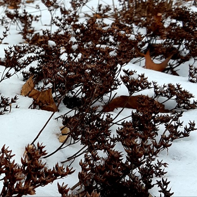 3 – the snow cover yesterday was quite shallow, hopefully we’ll get a lot more today to help insulate things. Here are the flower stalks of an unknown low Sedum sticking up.