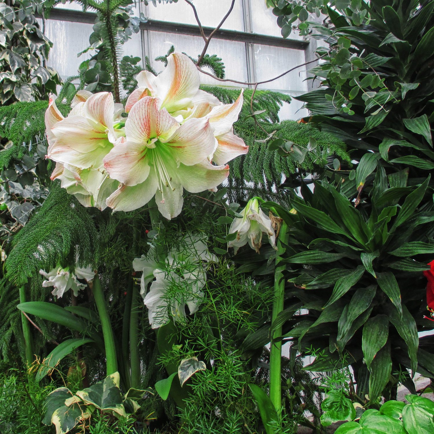 Speaking of Amaryllis, there are many in full bloom. Some are a deep crimson but most are white, or white with pink highlights. Some are HUGE and some are small. My favourite, I think, is the short double white.