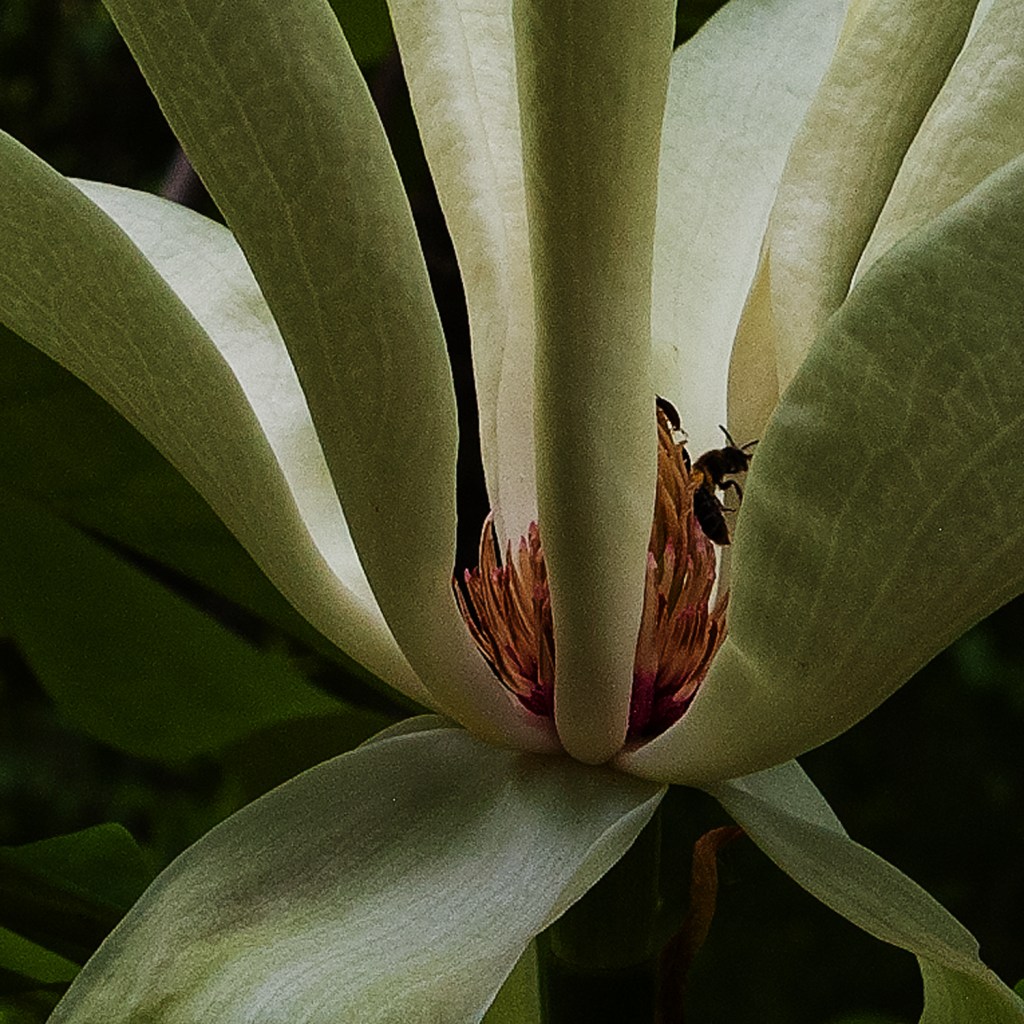 But that much is obvious. What I found interesting, and what I learned, was that the botanical name – tripetala – refers to the three sepals – a word I also just learned – that protect the flower bud itself while developing. Very handy up here, a bit north of its ‘natural’ growing range, since we are prone to surprise, late, frosts. You can see them quite clearly in this photo of a flower starting to open: