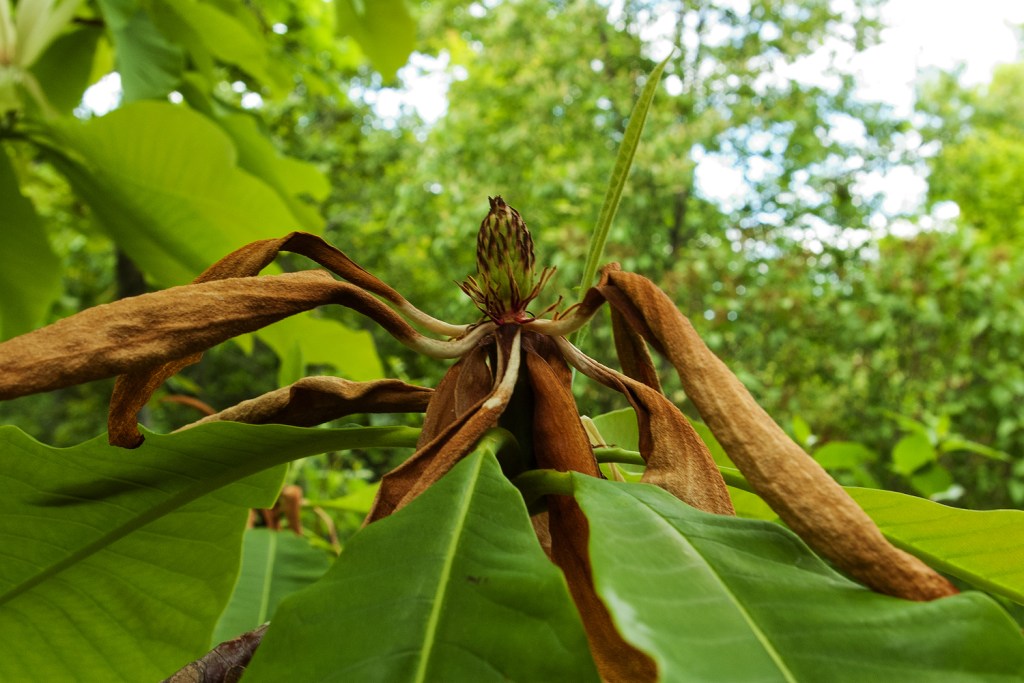 Magnolia tripetala – commonly called the Umbrella Magnolia. It’s my favourite Magnolia, but possibly only because I grew mine from seed. I’ve written a bit about it before, and I’ve shown a few photos here and there, but today, as the flowers fade and seed heads expand, I learned something new about it, and about plants in general, so I thought I’d share.
