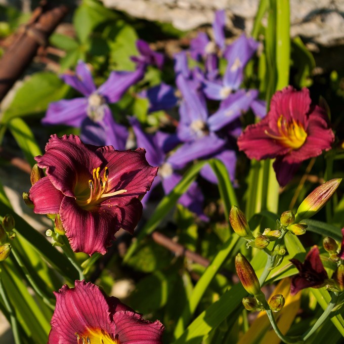 Anyway, here are three versions of the same shot from my garden, taken Saturday morning. A small dusky red Hemerocallis, variety unknown, in front of a very healthy Clematis x durandii. This is a really cool, rambling, Clematis – one of my favourites. You can read all about it here.