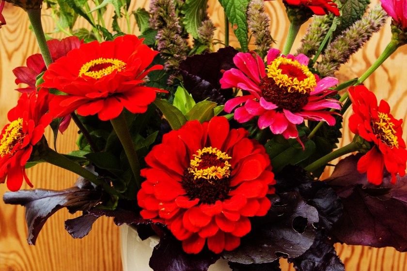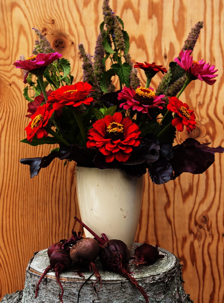 Nicely balanced arrangement Chris. The zinnias still look gorgeous and I bet those beets were delicious.