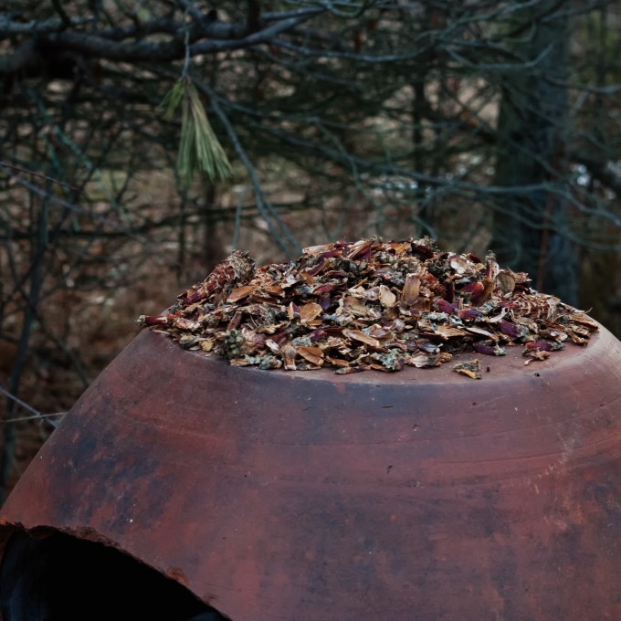 4: Evidence that the local squirrel (I think) population is well fed! Pine cones totally pulled apart on this broken, upside-down clay pot which is being used as their dining room table, and banana peels pulled out of the compost pile and deposited along the compost bin sides…so weird! Funny thing about the pine cones – I noted throughout the summer a few empty pots were being filled with cones that had fallen from nearby trees. Looks like the critters had their own pantry!