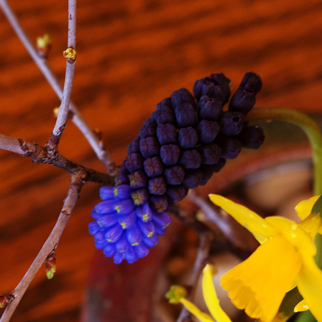 The flower on this Muscari starts out dark blue, almost indigo, and as it grows and matures, the tip turns a lighter blue. It’s really striking, I think.