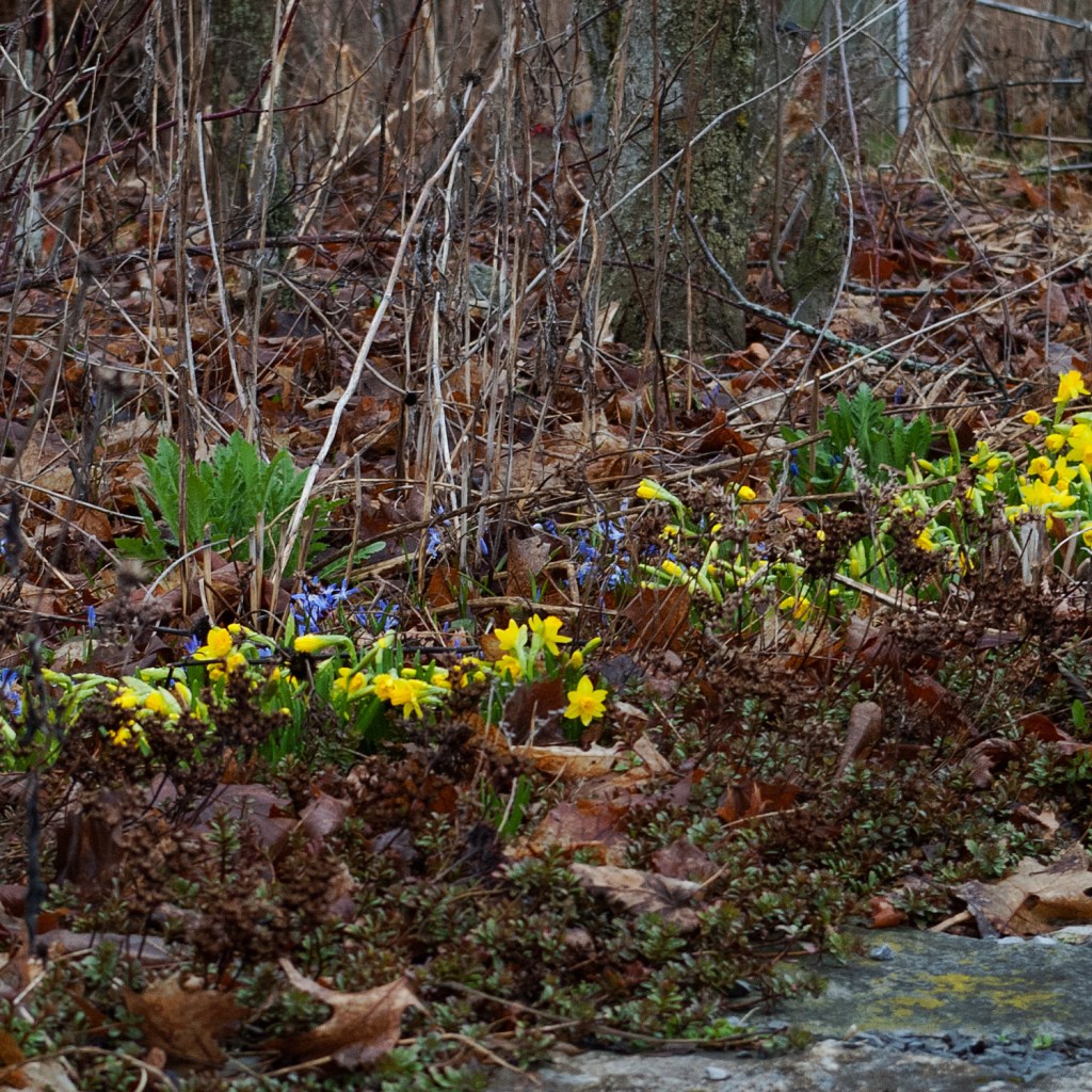 The daffs are likely Tate-a-Tete, although I can’t be sure. I buy several small pots of daffs in late winter to provide a foreshadowing of spring – they’re labelled simply ‘Mini Daffodils.’ Come spring, I plant them out and they come back, year after year. Here’s the row that I cut these from: