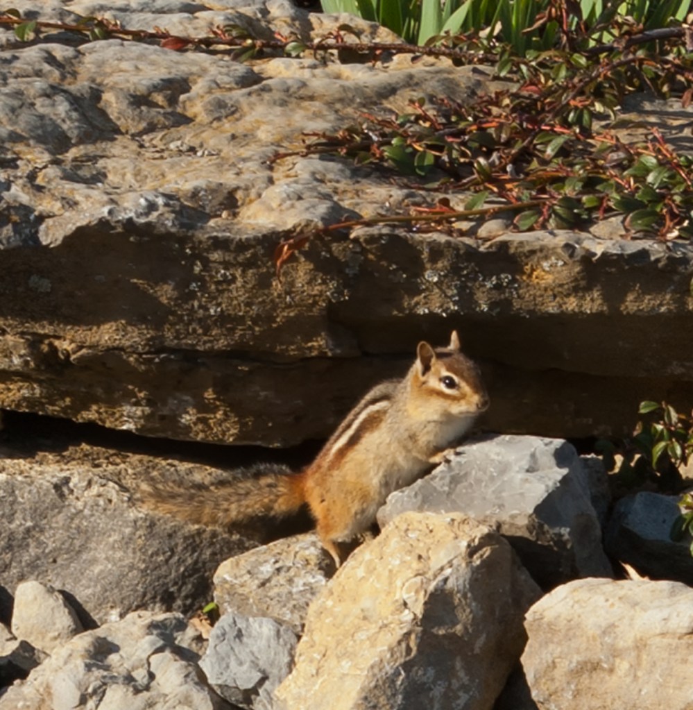 Chipmunks are EVERYWHERE this spring! They seem to be getting used to me working from home, popping out into the garden at all hours of the day. This was not taken with a telephoto lens – I just happened to be walking through the side garden and heard a rustling. This little one looked at me for a long while while I snapped away, before it scurried into its burrow in the stone wall.