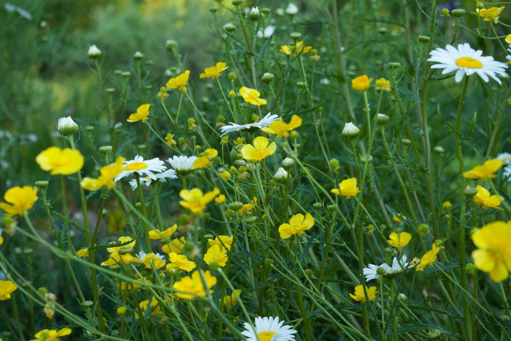What says ‘summer’ more than a meadow filled with wild flowers? These buttercups and Ox Eye daisies aren’t in my meadow – they’re a small part of a garden bed close to the house. It’s all in the camera angle!