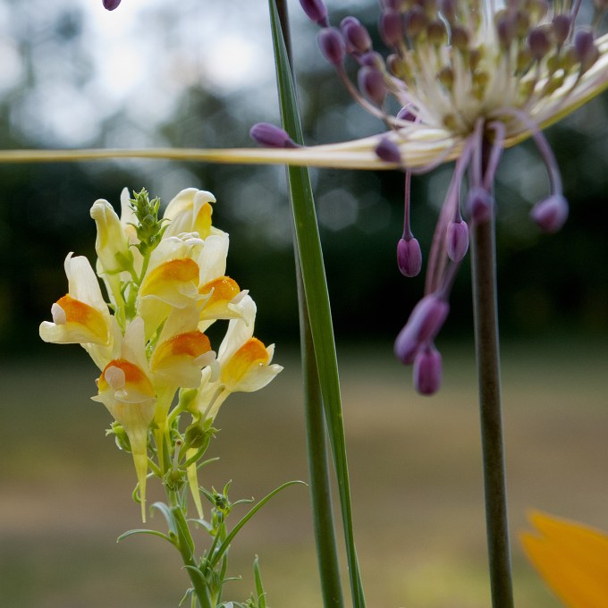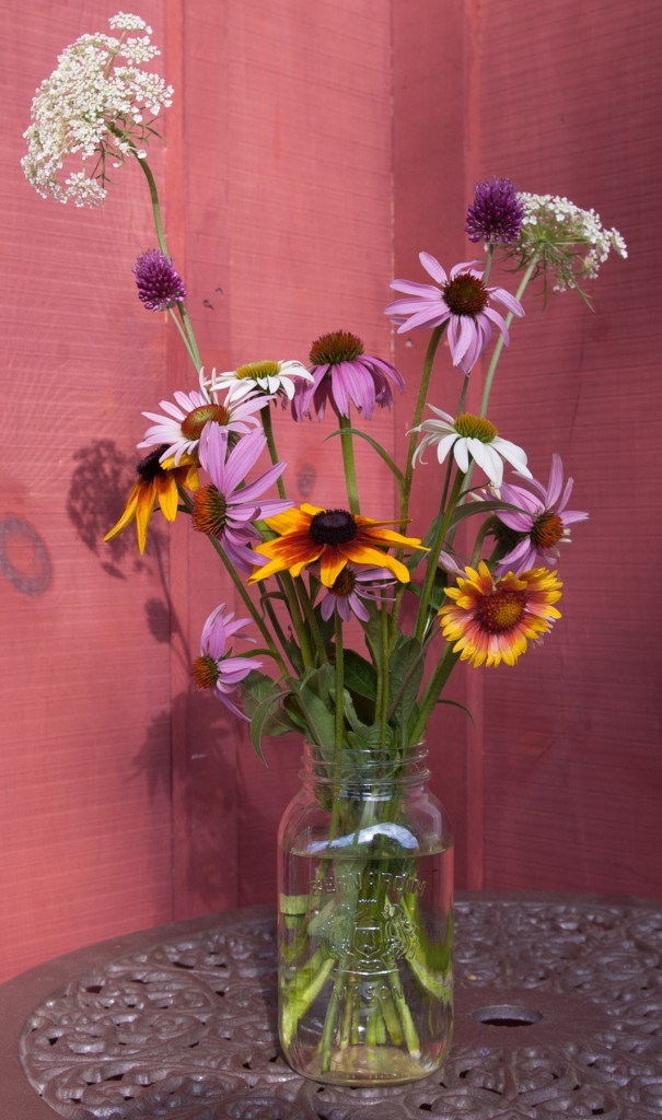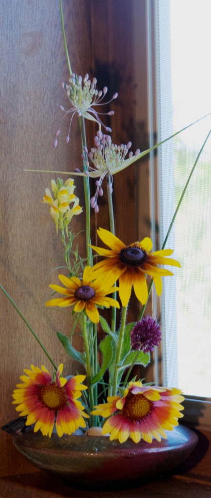 On the kitchen window ledge, and outside on the patio. Allium carinatum (Keeled Garlic), Linaria vulgaris (common Toadflax), join a few small blooms of Gaillardia (Blanket flower), Allium sphaerocephalon (Drumstick Allium) and Rudbeckia hirta (Gloriosa daisy).