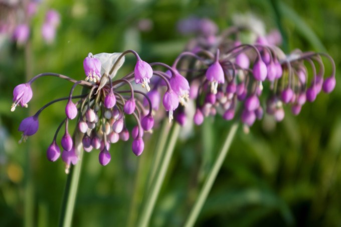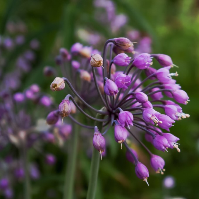 Allium sphaerocephalon, commonly known as Drumstick Allium, is perhaps the most familiar of the three. The small bulbs are easy to plant and inexpensive to buy, and they reproduce with ease. Simply let the flowers go to seed and then let the seeds fall. In the early spring, with frost heave, I often find a multitude of small white bulbs, sometimes with green sprouts already, on the soil surface. These I collect and plant all over. Native to Europe, northern Africa and western Asia, these are quite tall (the flower stalks can grow two to three feet high – up to 90 cm) but so slender, with foliage looking like round grass, they don’t take up any room at all. The flowers themselves are small, just a bit bigger than garden chive flowers, with a similar colour, although they start out as a tight green ball before changing to a purply magenta.