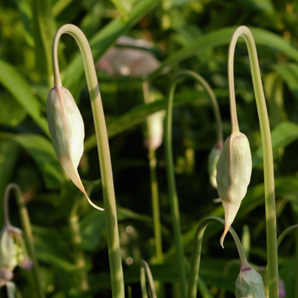 Allium carinatum – known as Keeled Garlic and sometimes Witch’s Garlic – is the same height as A. cernuum and has a similar looking flower, but it emerges from the stalk quite differently: