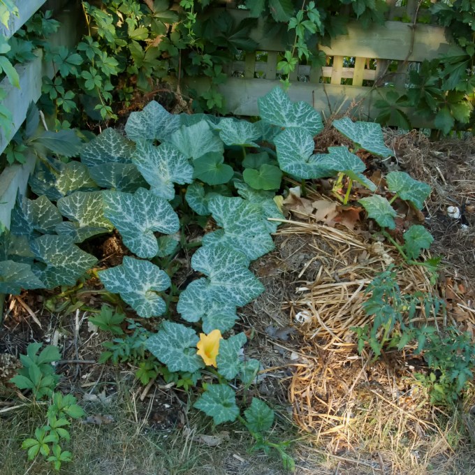 Every year something sprouts up in the compost heap – usually a melon or squash of some sort. And tomatoes. Here’s my entry in the 2020 Mystery Compost Volunteer competition: