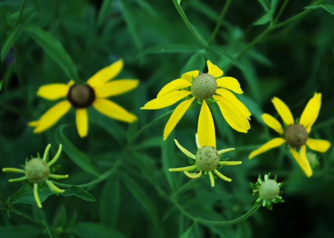 Finally, Ratibida pinnata – known as Grey Headed coneflower, or Prairie Coneflower – is the most prolific self-seeder I’ve ever known. It likes moist soil so this year the flower stalks are a bit stunted (some are downright shriveled), but somehow their seeds get transported to the far reaches of our sprawling property. It’s kinda cool to see these spires of yellow swaying in the breeze.