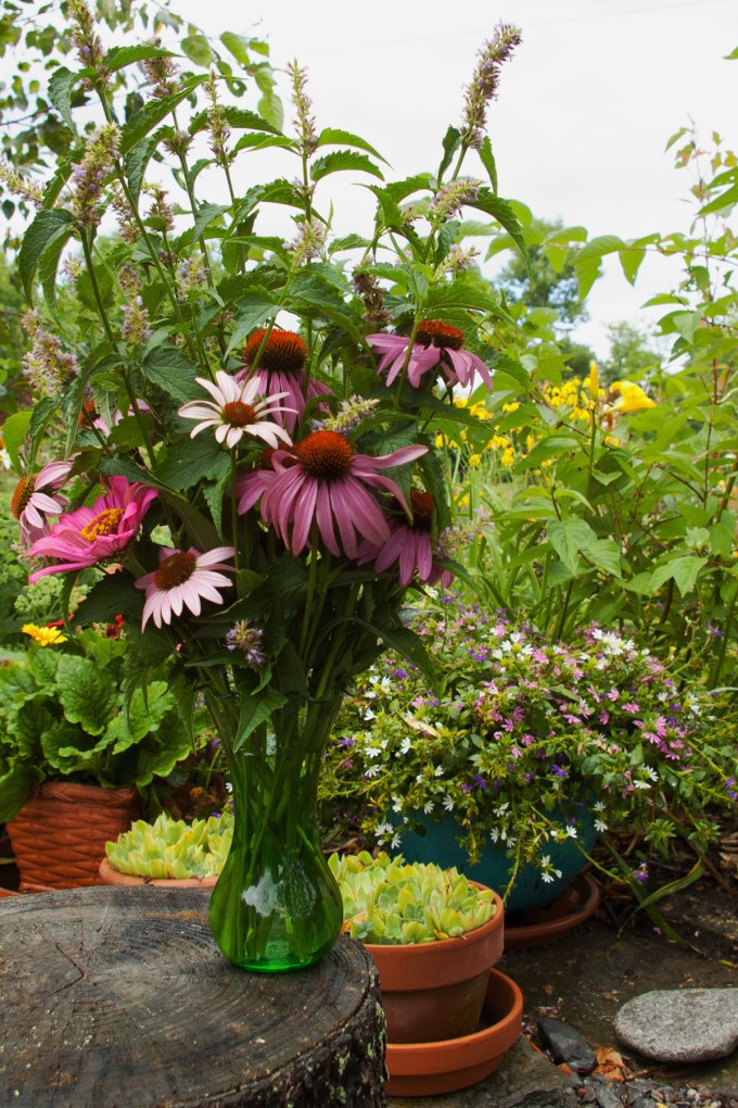Last week I cut white flowers; yesterday, in between some most welcome rain showers, I cut purple (and purple-ish) flowers. Each Monday Cathy at Rambling In The Garden encourages us to share a vase highlighting what is growing in our gardens. In my garden, what’s growing well right now is Echinacea and Agastache, with Zinnias starting to make a strong showing.