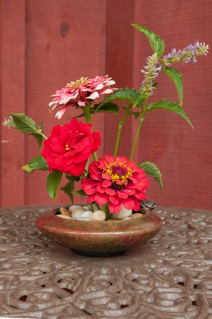 Very nice arrangements, Chris. The vertical accent of the Agastache is a nice counterbalance to the Echinacea and Zinnia. I keep forgetting my two ikebana vases and various frogs I could be using. Maybe next week!