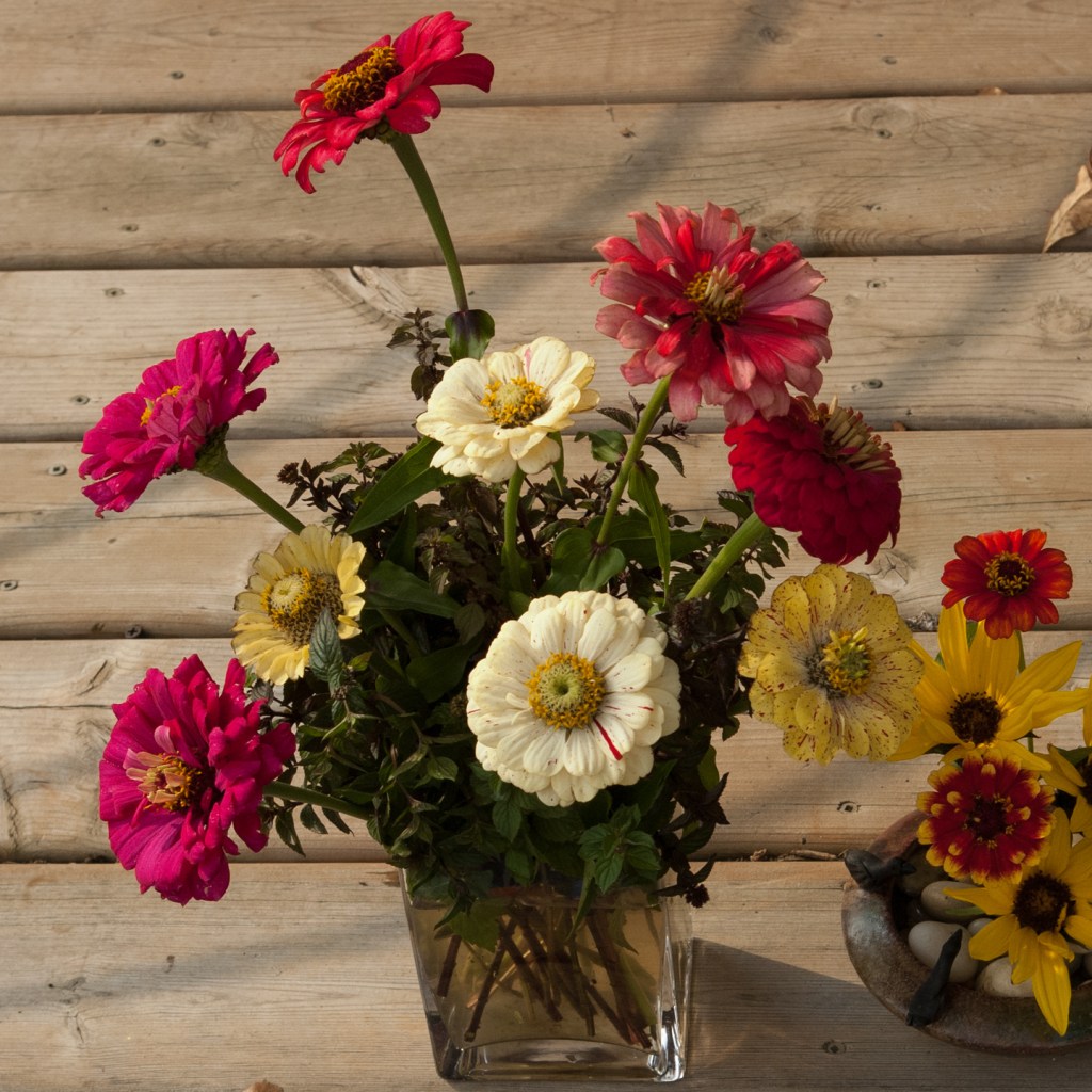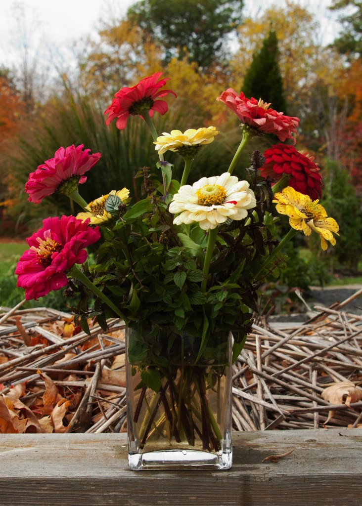 Although a vase filled with green leaves can be appealing, especially when the leaves are fragrant, I thought I’d raid the Zinnia patch to add some pizazz. Might as well use them while we can, right? Here’s the final vase: