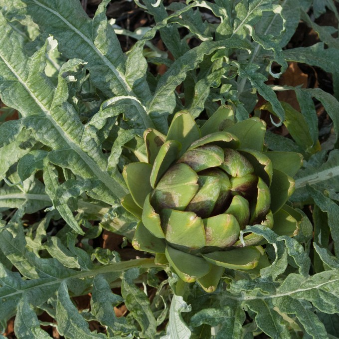 An update on two veggies still growing. My one and only cucumber of the year, now about six inches long, is still getting bigger (I may need to protect it overnight..) while my one and only artichoke flower bud is slowly showing signs of opening…