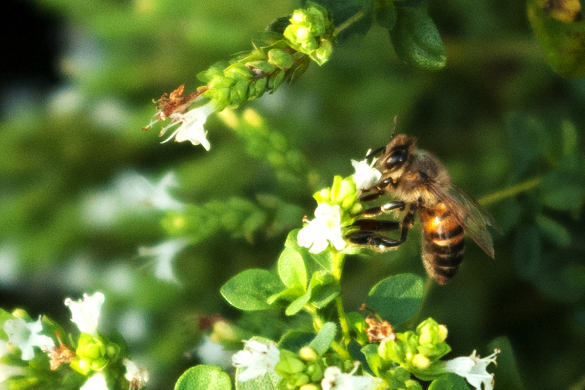 Our honeybees are busy gathering a last bit of pollen and nectar to get them through the winter ahead. One of the reasons I let Greek Oregano proliferate is it keep flowering right until hard frost, providing food for quite a few pollinator species.