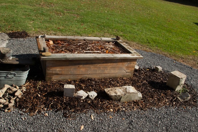 The garlic I showed you two weeks ago is now nicely planted in this relocated raised bed. It used to be near the back of the property, but watering proved onerous so I moved it closer to the back of the house, next to a downspout and rain barrel and trough. I topped the soil with dead leaves and daylily flower stalks both to act as a mulch and to decompose and add organic matter to the bed. In seven months (!!!) I’ll plant peppers and herbs in the mulched soil, at the bottom of the raised bed.