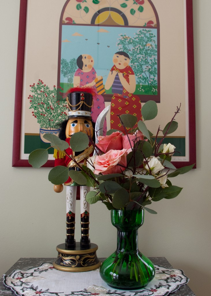 Yesterday morning my flower bouquet was fading fast – white stock blossoms falling to the table like the snow flakes floating to the ground outside, and the edges of the roses starting to brown. I thought of Wabi-sabi and pulled apart the bouquet, keeping the roses that still seemed to have a few more days left, adding them to a green glass hyacinth vase that already had a few red osier dogwood (Cornus sericia) twigs in it. I finished the vase with the Eucalyptus and thought what a perfect final Monday Vase of 2020 for Cathy’s weekly theme. Happy New Year everyone – here’s hoping that life in 2021 returns to ‘normal!’