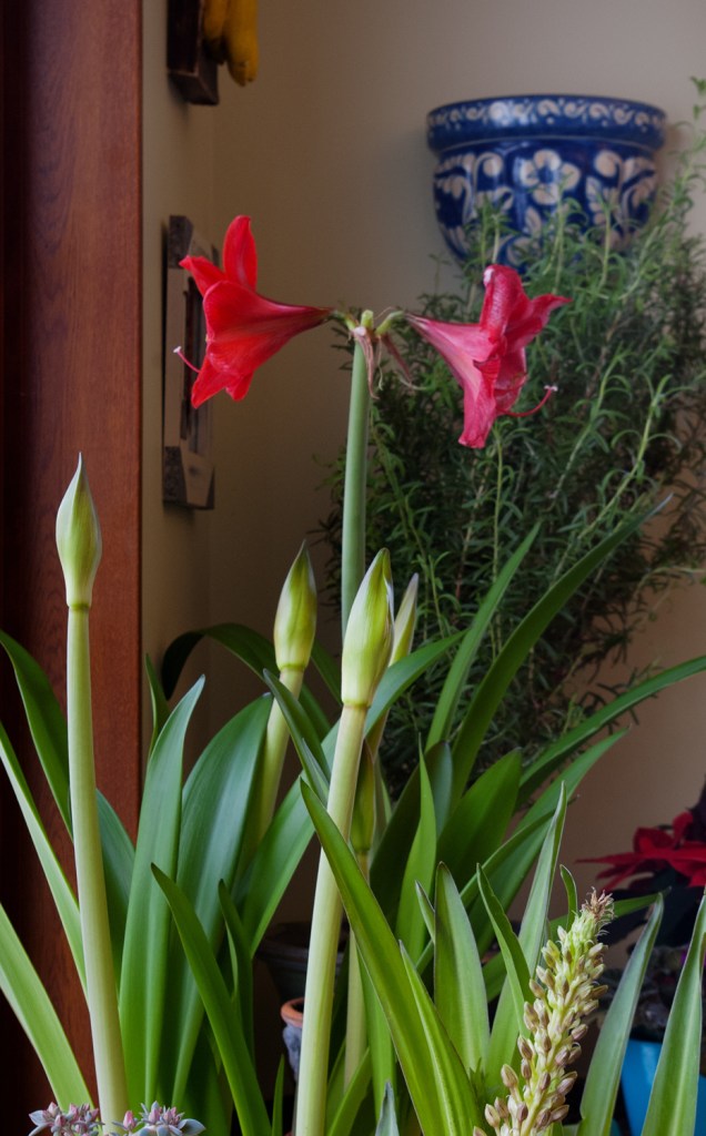 The aforementioned Amaryllis – Hippeastrum – there’s a mini-forest of pink and white ones about to bloom in the dining room window.