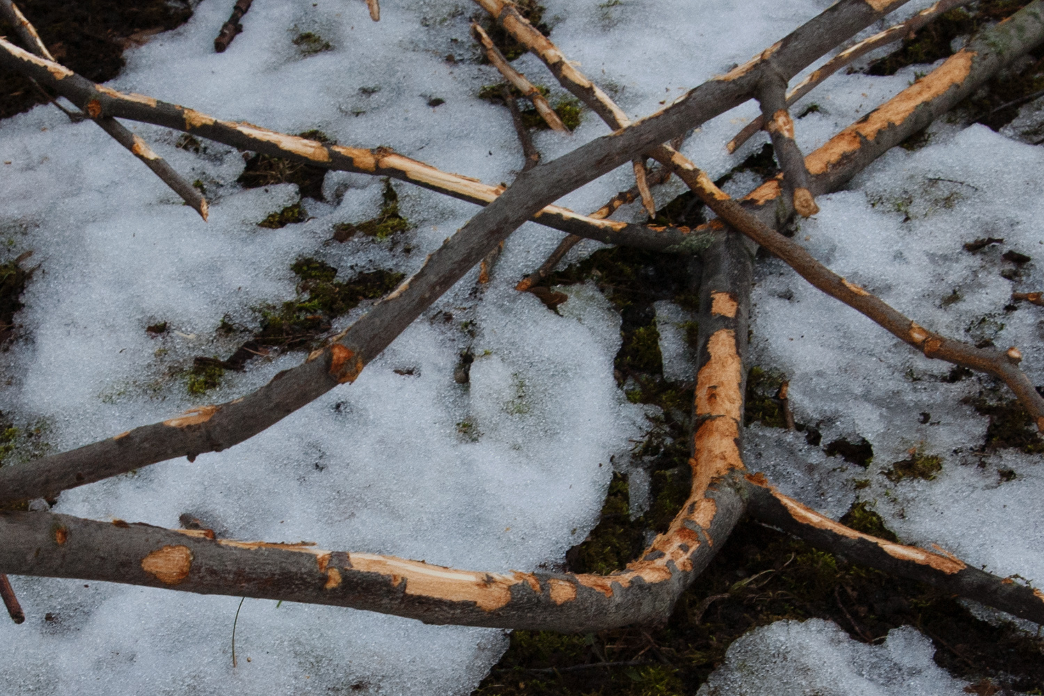 I trimmed off some branches of a basswood tree – Tilia americana – on new year’s day (a warm and sunny day it was) and left them on the ground. It appears basswood bark is a delicacy for some critter – better these branches than the ornamental shrubs that are often a winter staple in my garden.