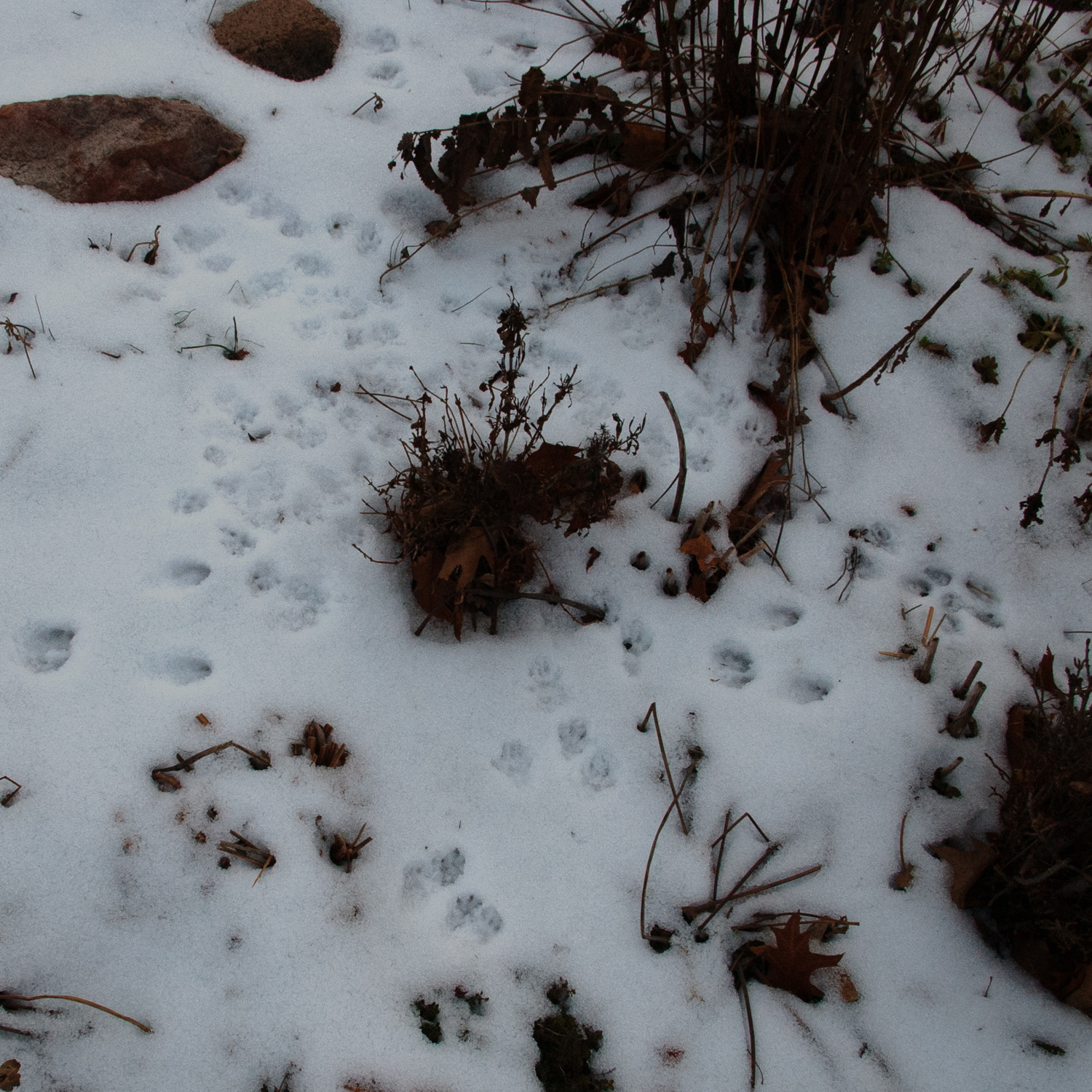 Tracks in the snow #2 – lots around this tiny Weigela – happily, the bush is, so far, unappetizing