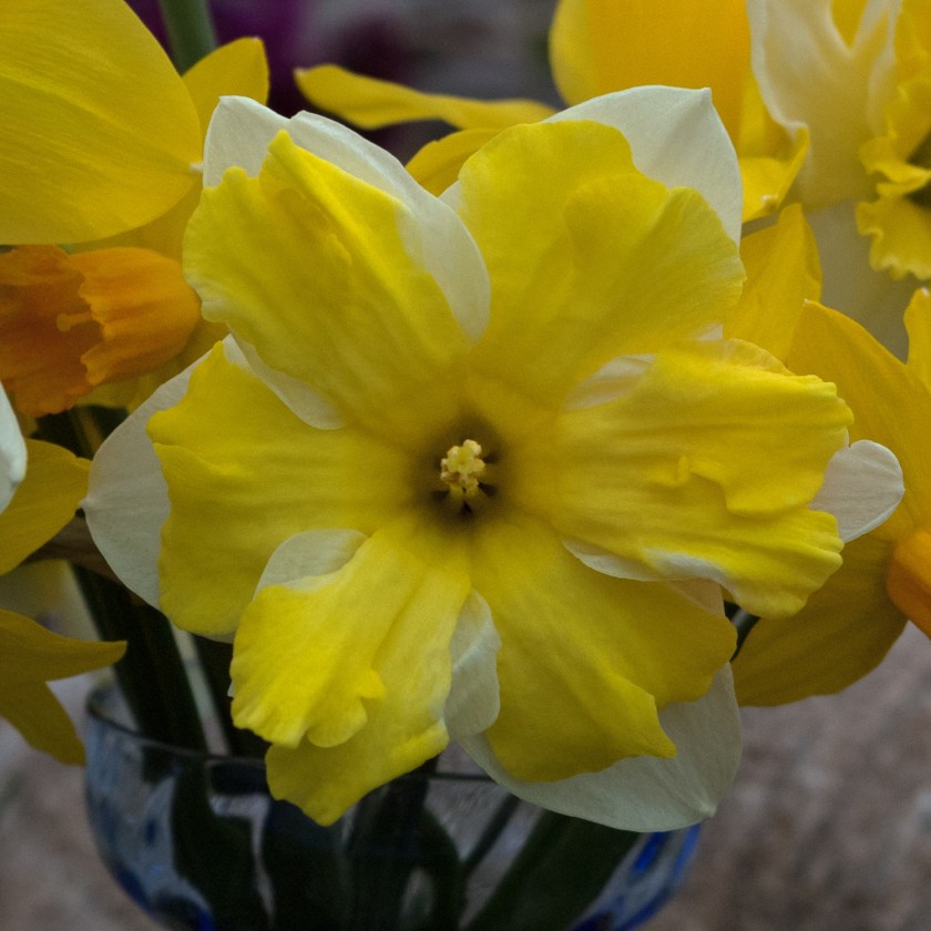 Three Narcissus varieties in this blue glass Hyacinth jar – King Alfred, Jetfire and, front and centre, Cassata (which has a much smaller bloom than it looks…)