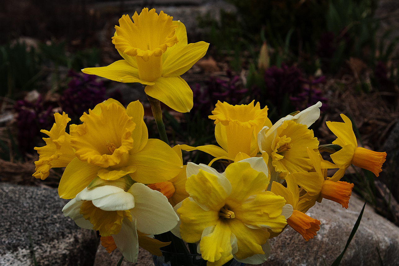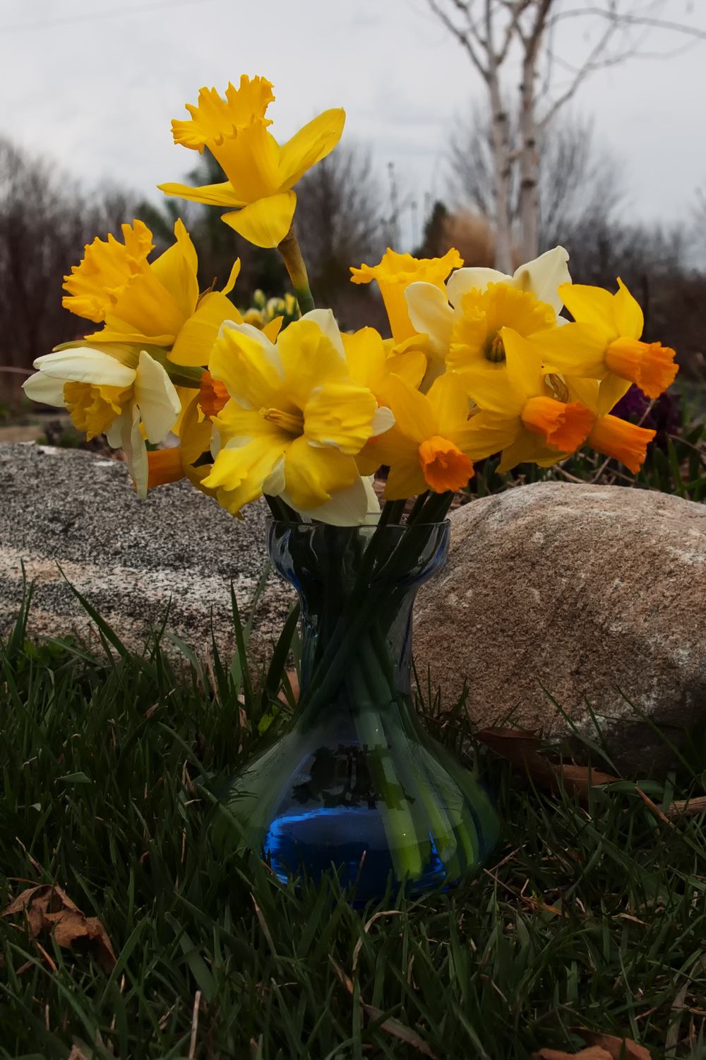 One week ago there was nothing but faded Galanthus in bloom in my garden. Today there’s a dozen or so different spring blossoms brightening the landscape. Amazing what a few unseasonably warm days will do in early spring! Every Monday Cathy at Rambling In The Garden encourages us to share a vase highlighting what is growing in our gardens. The highlight today has to be the hundreds of early daffodils now sharing their sunny and very welcome optimism – not only in my garden but across much of Ontario.