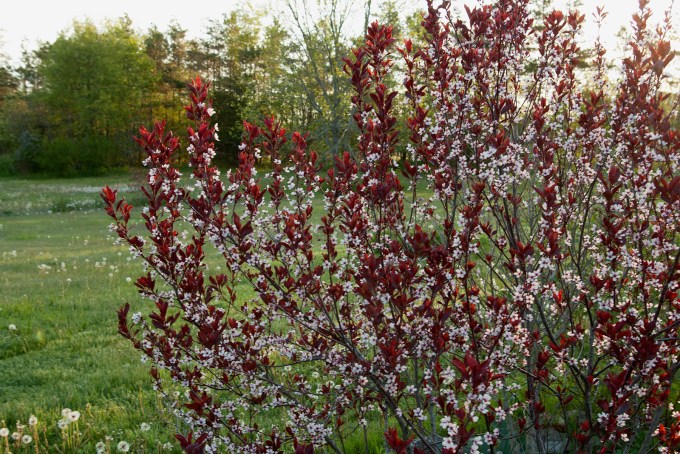 Every week Jon, The Propagator, invites gardeners to share six things happening in their gardens. First up for me is this lovely purple leaf sand cherry – Prunus x cistena. A cross between Prunus cerasifera (cherry plum) and Prunus pumila (sand cherry), it was hybridized in 1910 at South Dakota University and has successfully adapted to my dry clay soil. Now in full bloom:
