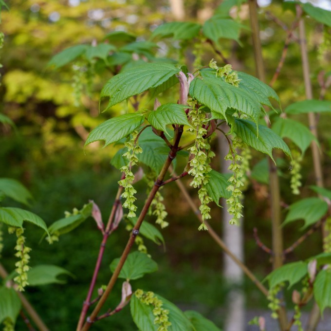 Striped Maple, aka Moose Maple, aka Pennsylvania Maple – Acer pensylvanicum is a small understory tree often found in the forest about 500 km north of here. I love the unusual leaf shape (for a maple) and the dangly flower clusters.