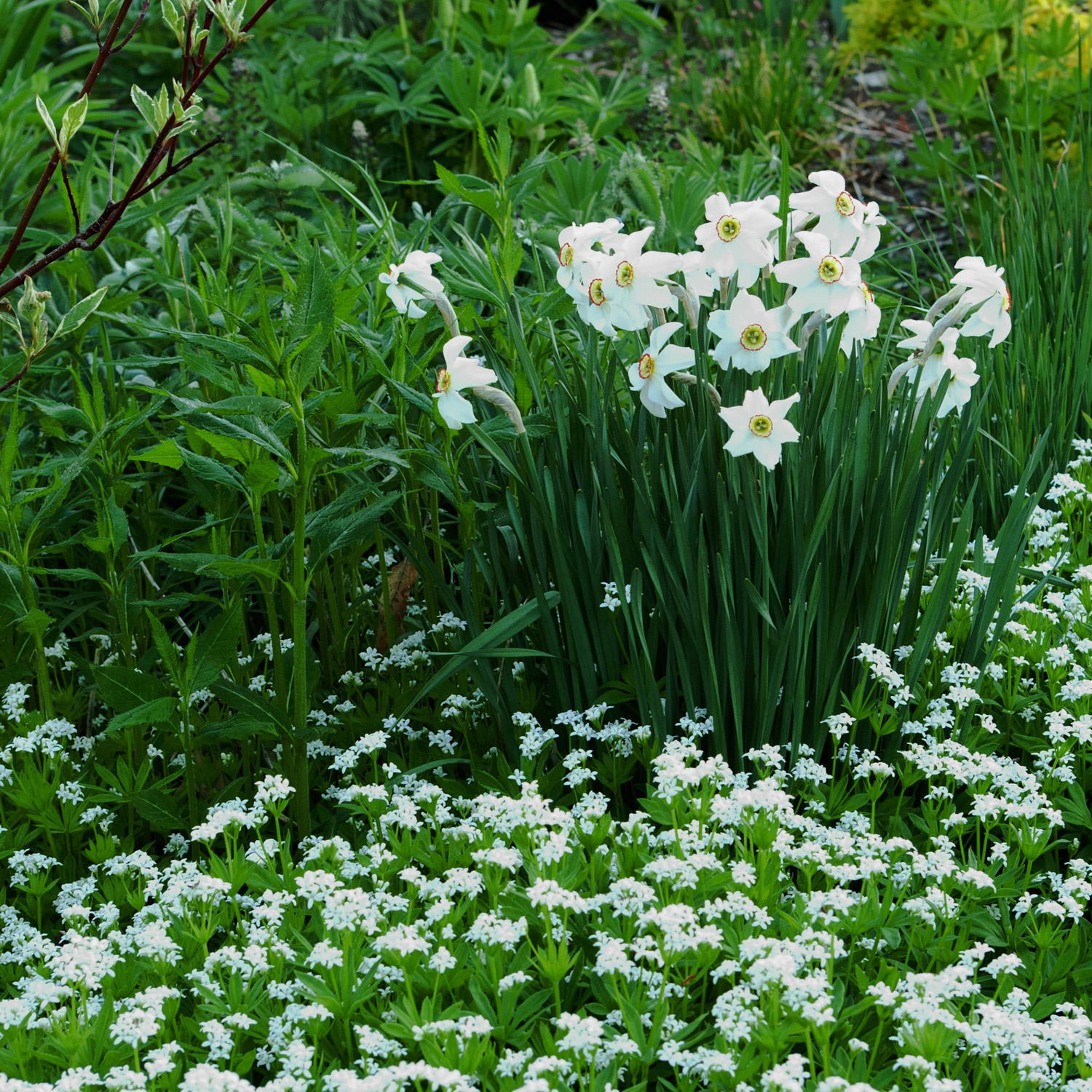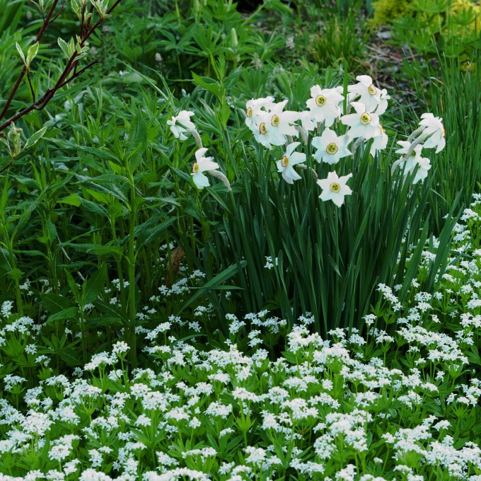 It’s still spring, so we must still have spring bulbs, right? In this case, Narcissus poeticus var. recurvis, surrounded by a small pond of Sweet Woodruff – Galium odoratum. They each have a light and lovely fragrance – it was quite intoxicating prepping (and planting) a nearby dahlia bed yesterday afternoon!