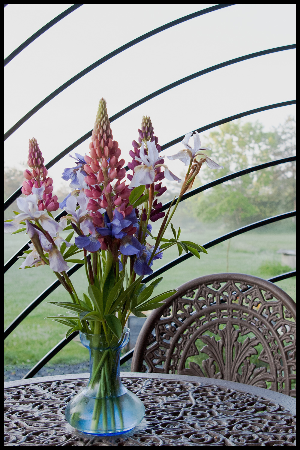 The big, blowsy peonies started to open yesterday, but it was so hot and humid I didn’t cut any. They’ll be around for a few more weeks. Today I’d like to share another simple vase featuring the two flowers that have made my late May/early June garden quite spectacular this year: lupins and Iris. Since the vase is small, I chose Siberian Iris in two shades, with most of their tall stems cut by almost half. Although I pulled the vase together last Friday, I waited until Saturday to take the photo, with the early morning mist still laying on the field beyond our back porch. Thanks as always to Cathy at Rambling In The Garden, who every Monday encourages gardeners to share a vase highlighting what is growing in our gardens.