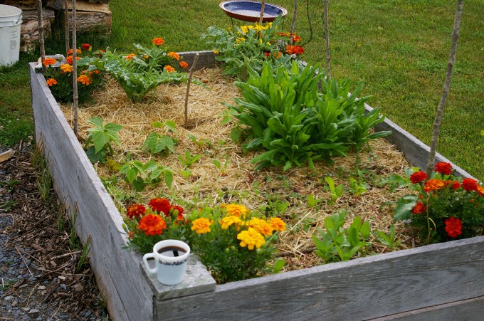 I moved two of my raised beds closer to the house to make watering easier. One has garlic and spinach and the other one has this mish mash of edibles and flowers. At the far end are artichokes, then yellow bush beans, carrots and chard. The large green things are strawflowers, the small green things close to this end are zinnias and of course marigolds are at the corners. And a dahlia! There’s a dahlia coming along in the front right corner, where the stick is. I kinda love this bed.