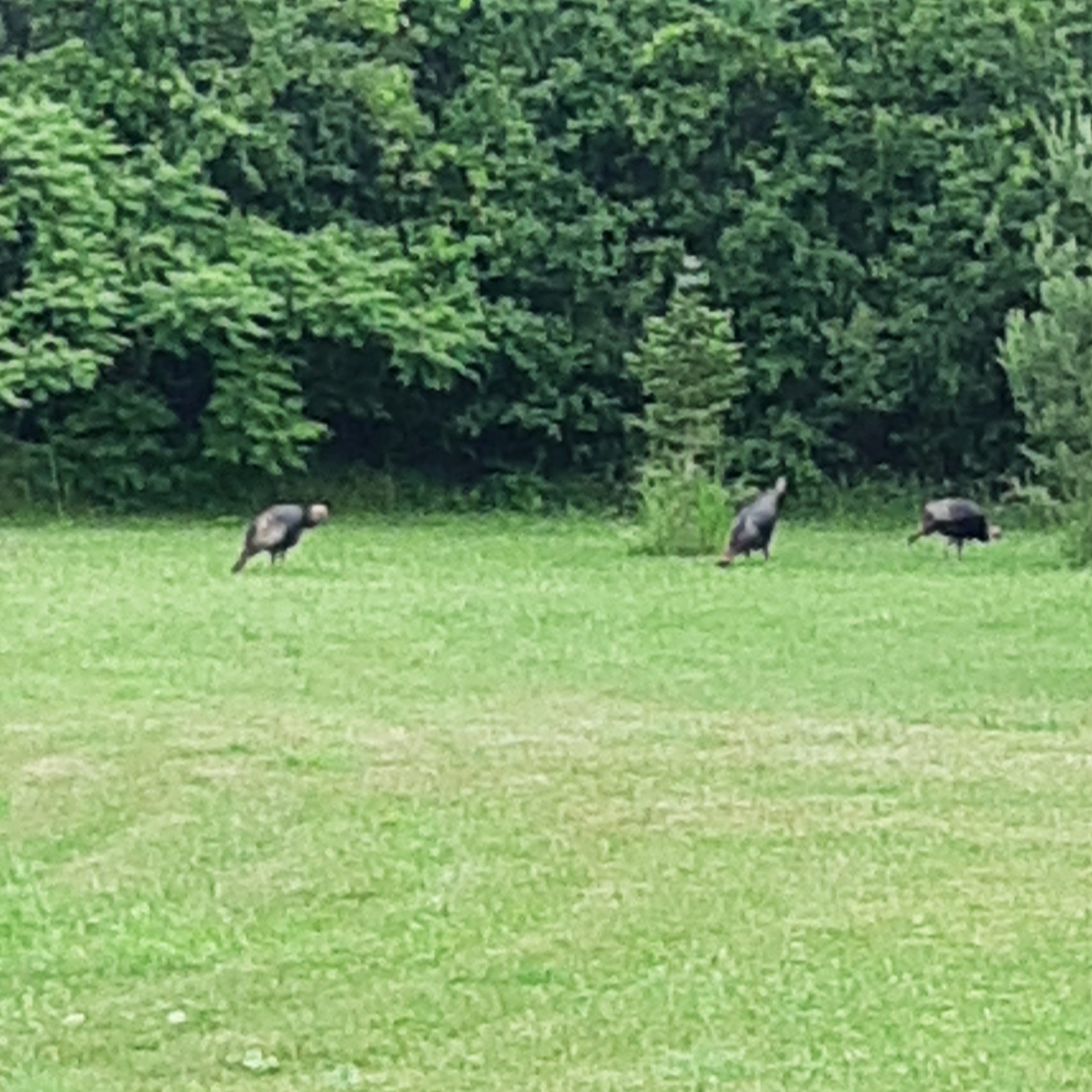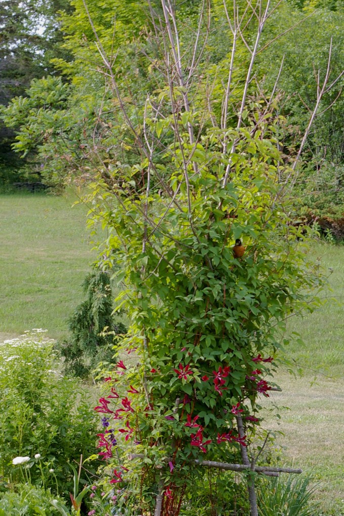 Before I go – just wanted to share a couple bird shots. I’m not a good bird photographer. At all! But I did mention robins and wild turkeys so thought I’d share. On Friday I posted a few pictures of my Clematis texensis ‘Gravetye Beauty’ blooming a lot earlier than normal. Yesterday I realized a pair of robins have started to build a nest in the middle of the thick vines covering the tutoir. And on Friday morning, while I was in the middle of a video meeting, I looked out the window to see the three turkeys calmly strolling across the yard. I wish you all happy strolling this weekend!