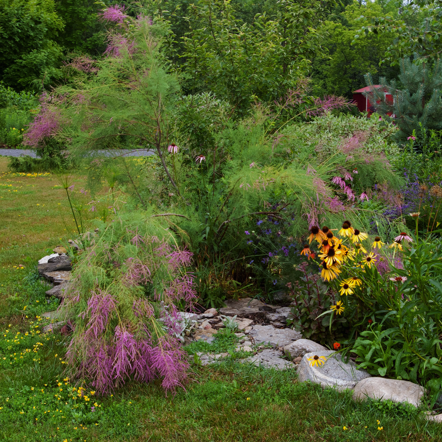 Finally, back to the rain. I have a Tamarisk in the side garden. It’s such an unusual shrub here, with a very incongruous form and foliage for the natural countryside where I love, but it has these pretty great pink flowers (here’s a close-up of the pink flowers, from an earlier post). It hasn’t yet developed a thick main trunk – just a lot of stalks coming from the ground that get taller every year. The rain was a challenge for the shrub, weighed down with thousands of tiny blooms, and its all bent out of shape. I’m hoping the branches will spring back up.