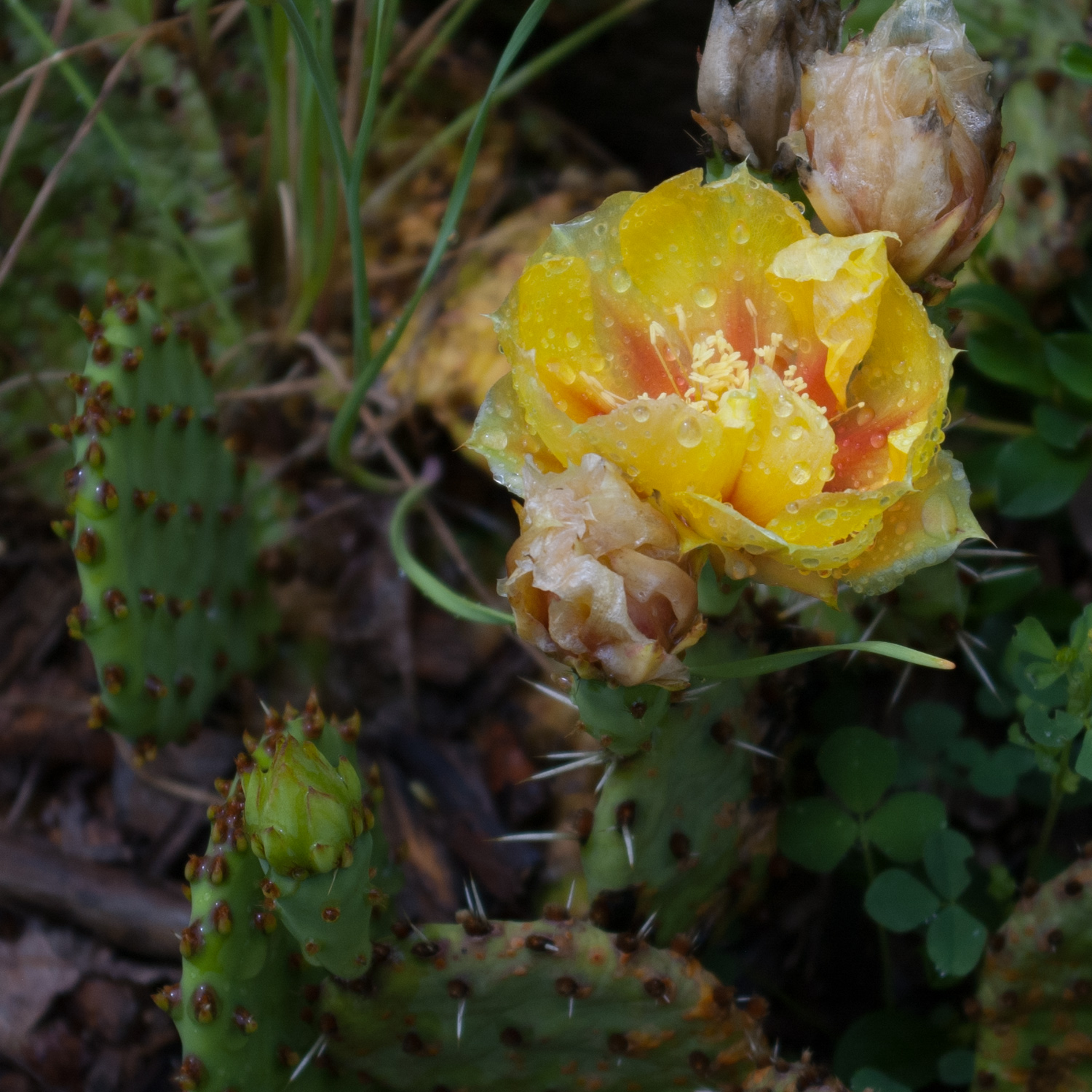 There’s weird weather all over the world right now, it seems, including in my little corner, where it feels July has been a lot cooler and wetter than normal. I’m not complaining – my rain barrels have remained full and the only watering I’ve had to do is the pots on the porch. Weeding is much easier and the birds are happy, as are trees and shrubs and flowers and tomatoes. My prickly pear cactus (Opuntia), on the other hand, likely would prefer more sun and less rain, but it’s still managing to push out a few flowers this week. Its normal habitat is a few hundred kilometres south west of here, on the sandy, quickly draining north shore of Lake Erie. I’m gratified it has forgiven me plunking it into my heavy rocky clay soil.