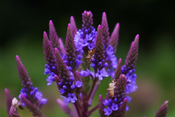Last week I had a photo of a Verbena that I purchased at local farmer’s plant sale. He thought it was V. bonariensis, and it certainly looks like it may be. This week I have another Verbena. This one has tiny flowers atop a tall stem; it seems to self seed as it has appeared in various locations in the garden over the past few years – I did not purchase or plant it although it may have been part of one of those free wildflower seed packets that appear in the mail every now and then. I really like its colour and form, as did these (what I’m guessing are) baby grasshoppers who hopped off when I got too close.