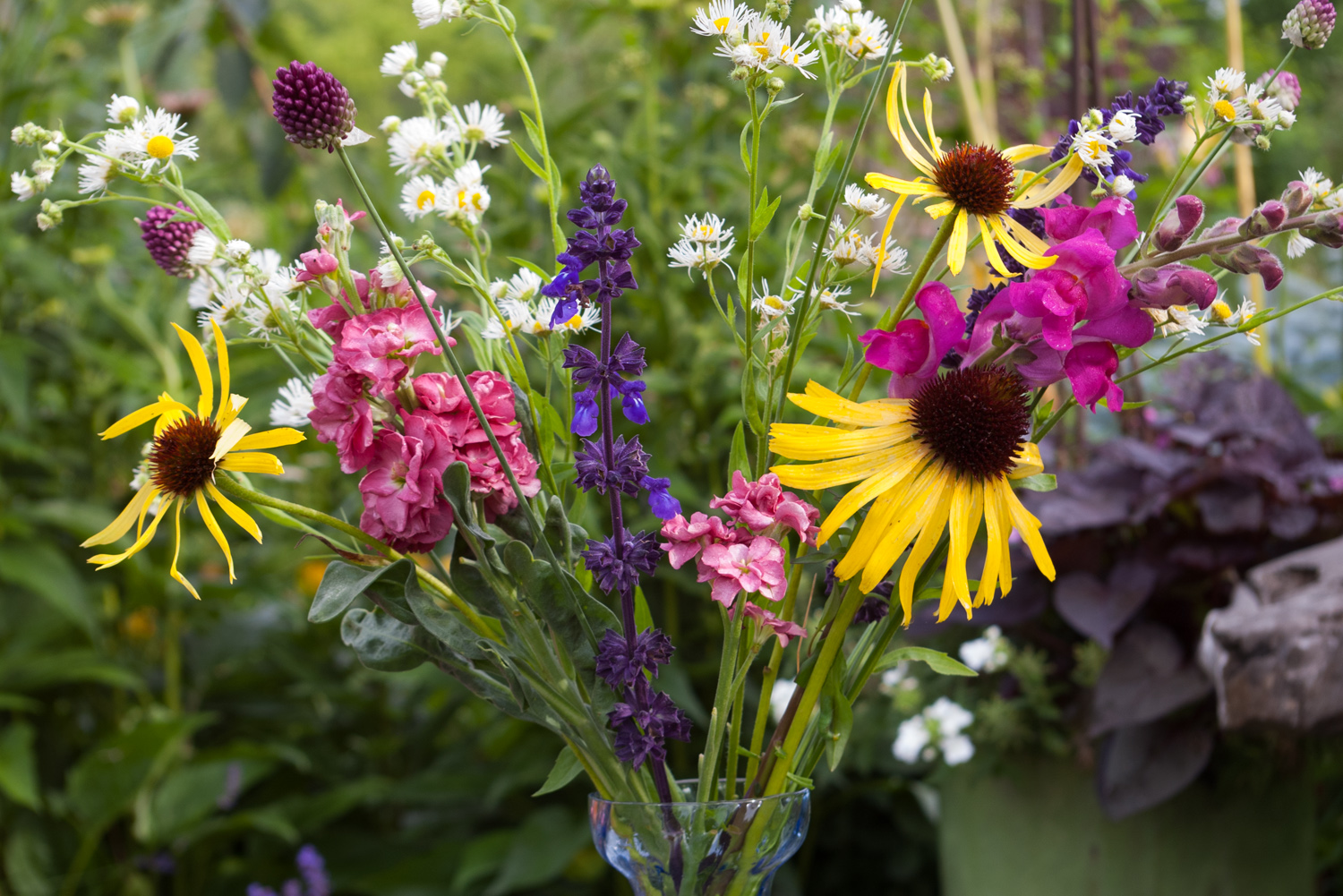 I do like this sort of vase that just shows off what is growing in the garden right now. π Love the yellow Echinacea. Such pretty petals.