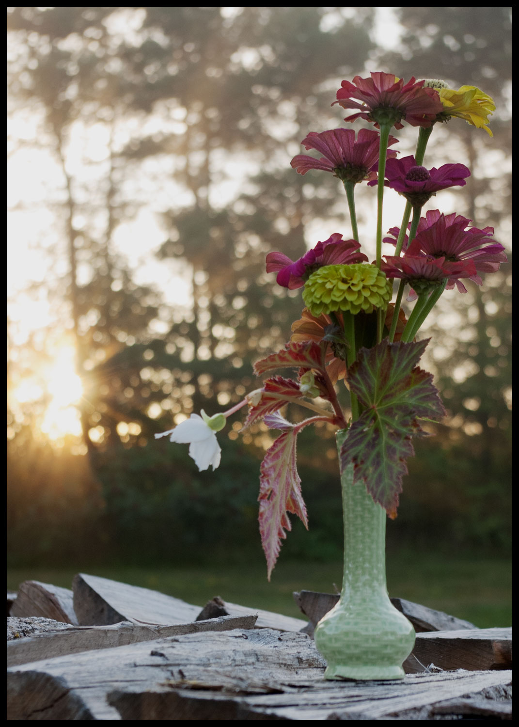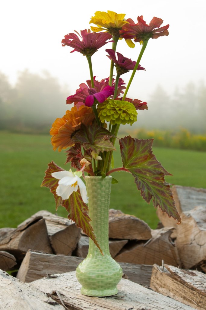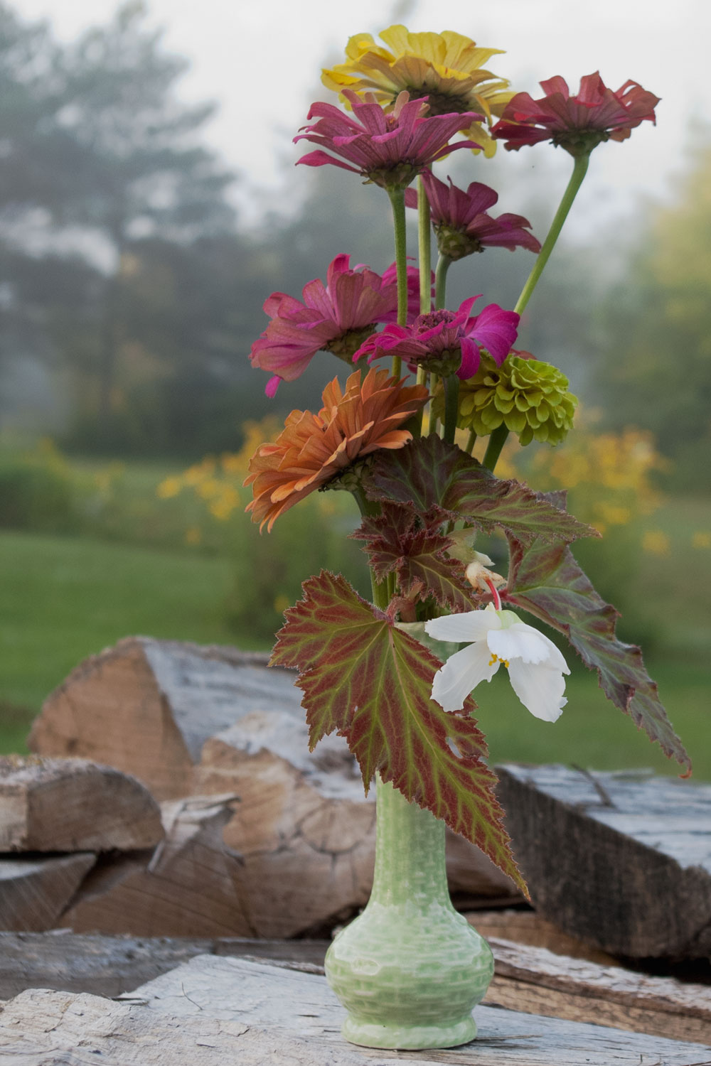We awoke yesterday to another sultry, steamy morning, with an early mist hanging around doing its best to spread mildew on squash and tomato leaves. It was very atmospheric though, and provided an interesting background for today’s vase: a collection of Zinnias accented by a Begonia fimbriata stem.