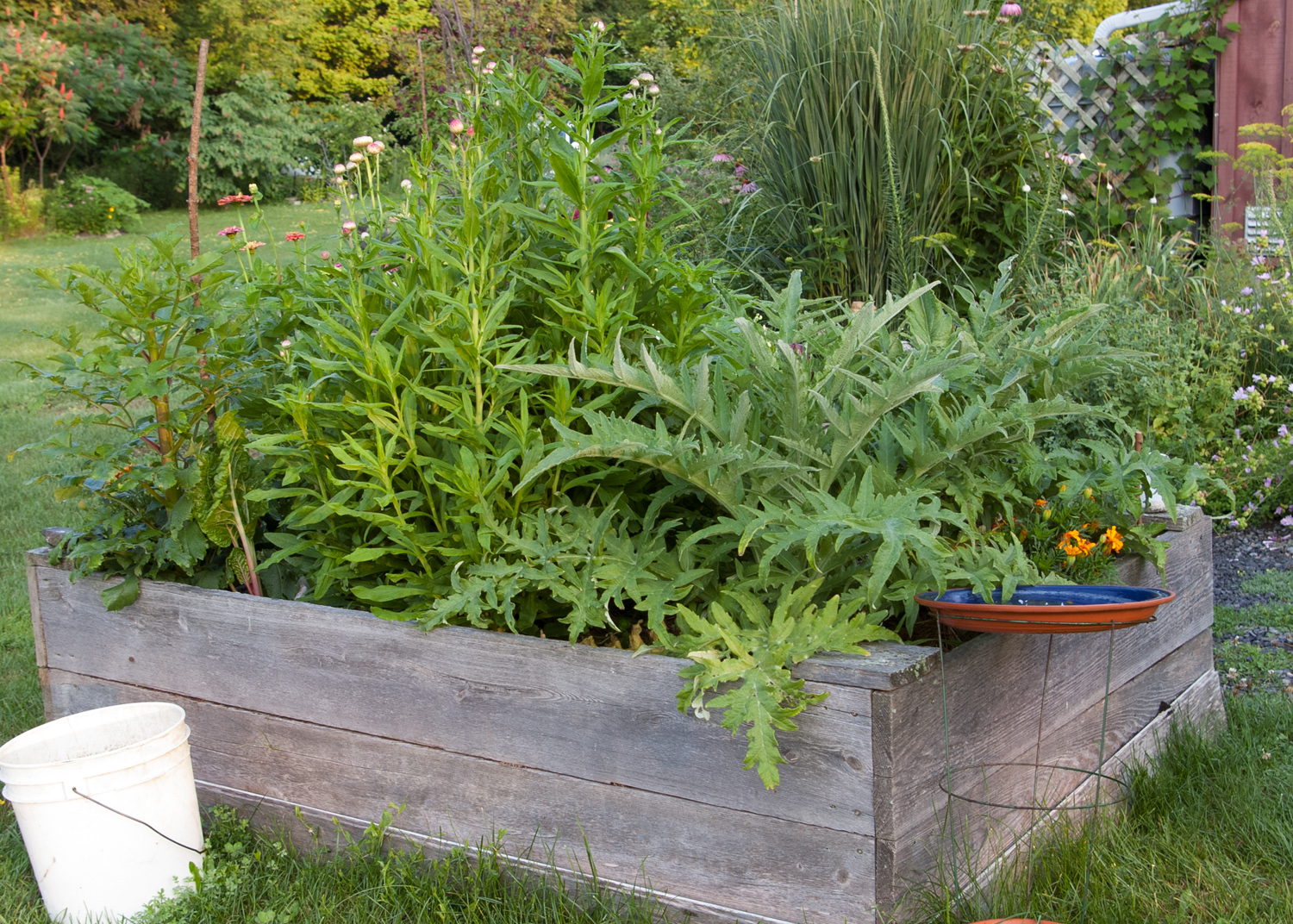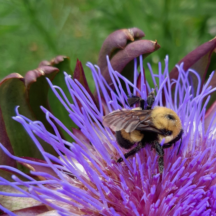 I’ve had off and on luck growing artichokes. Some years lovely large leaves form but no flower stalk, other years a stalk appears so late in the year it doesn’t have time to form a bud, let alone flower, before a hard frost kills it all. Some years rabbits think they’ve been planted strictly for their enjoyment – and dinner. This year I had a three pronged approach to growing this flower. (yes, I know, artichokes are a vegetable, people eat the flower bud – I eat artichokes all the time – but since I only grow a few every year, I let the buds develop into beautiful, thistle-like flowers.) My strategy: