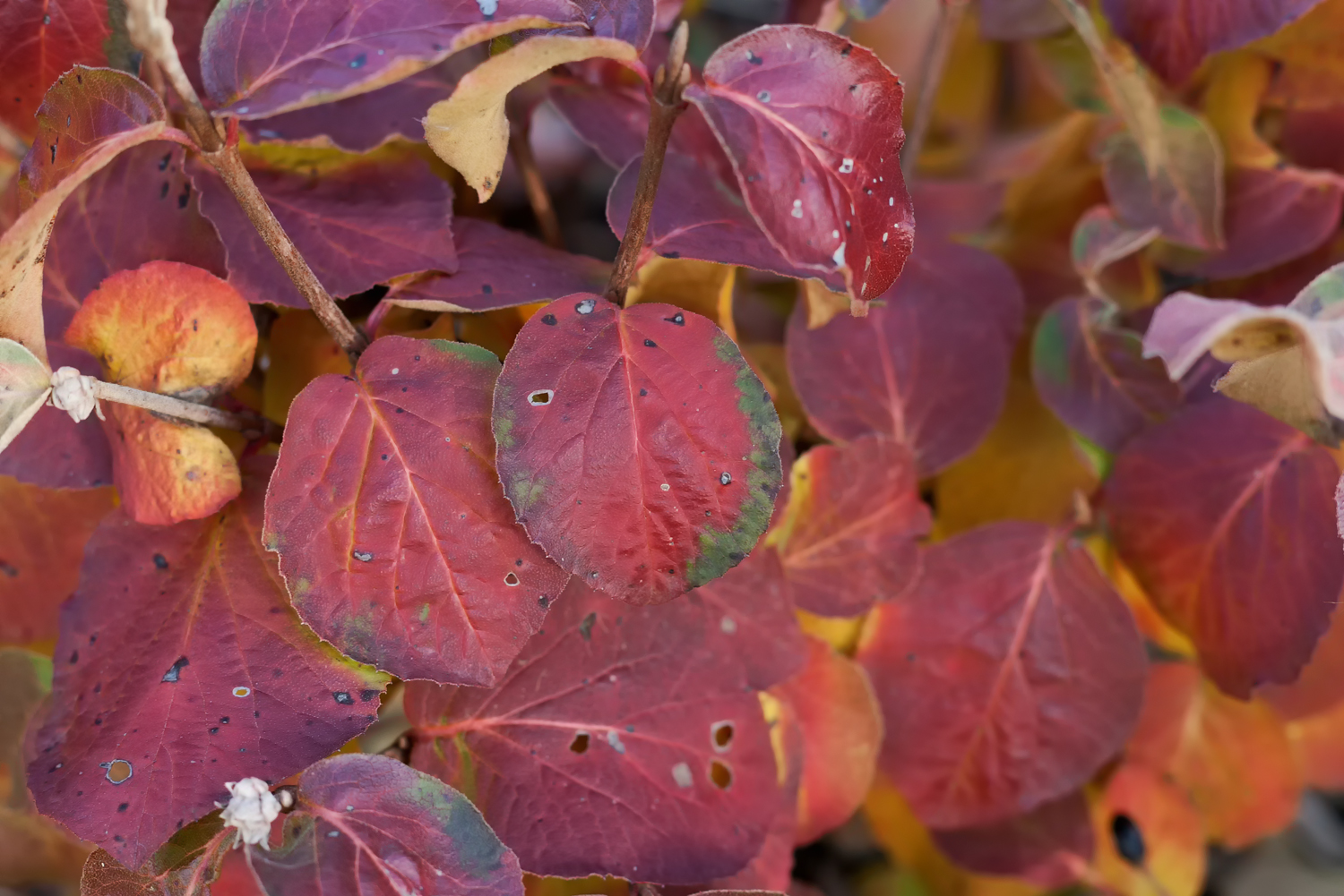 Great autumnal colours. The foliage of my Viburnum carlessi has yet to turn all autumny. I hope it looks as good as that when it does.