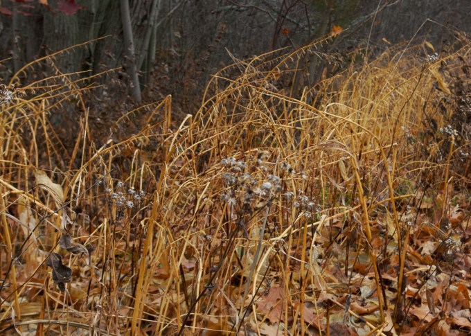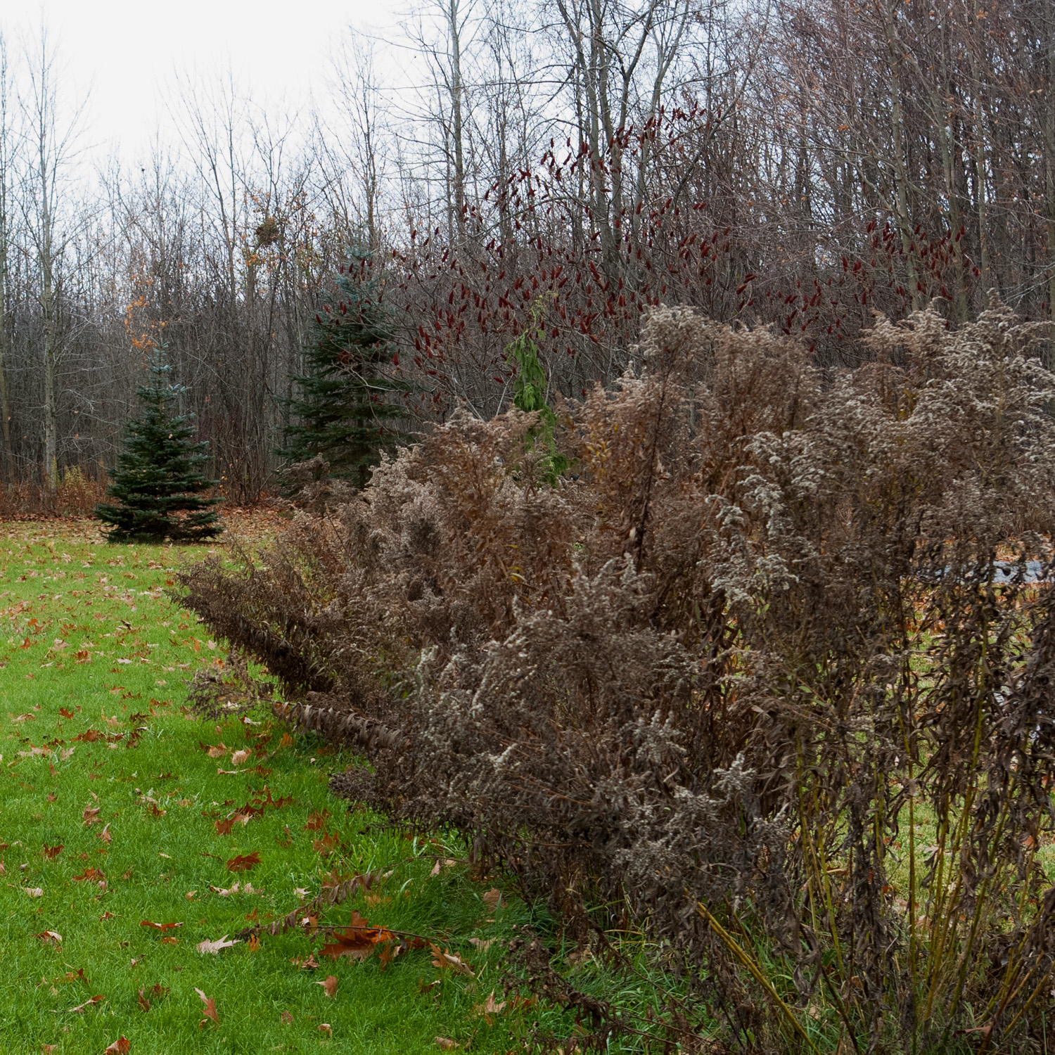 I’m pretty lax about cutting back perennial flower stalks in the fall, even for plants considered weedy by some. It’s partly because at this time of year I’m tired; at this time of the year it’s cold outside and I’m not overly keen on mucking about the yard; but mostly it’s because I know that dead flower stalks provide habitat for overwintering beneficial bugs and also provide food for birds. This last point was made evident to me yesterday morning as I was entertained by a half dozen small birds flitting amongst goldenrod seed heads left standing on the other side of the dining room window. They were pecking away, looking for the tiny seeds that would help them stay alive over the long winter ahead.