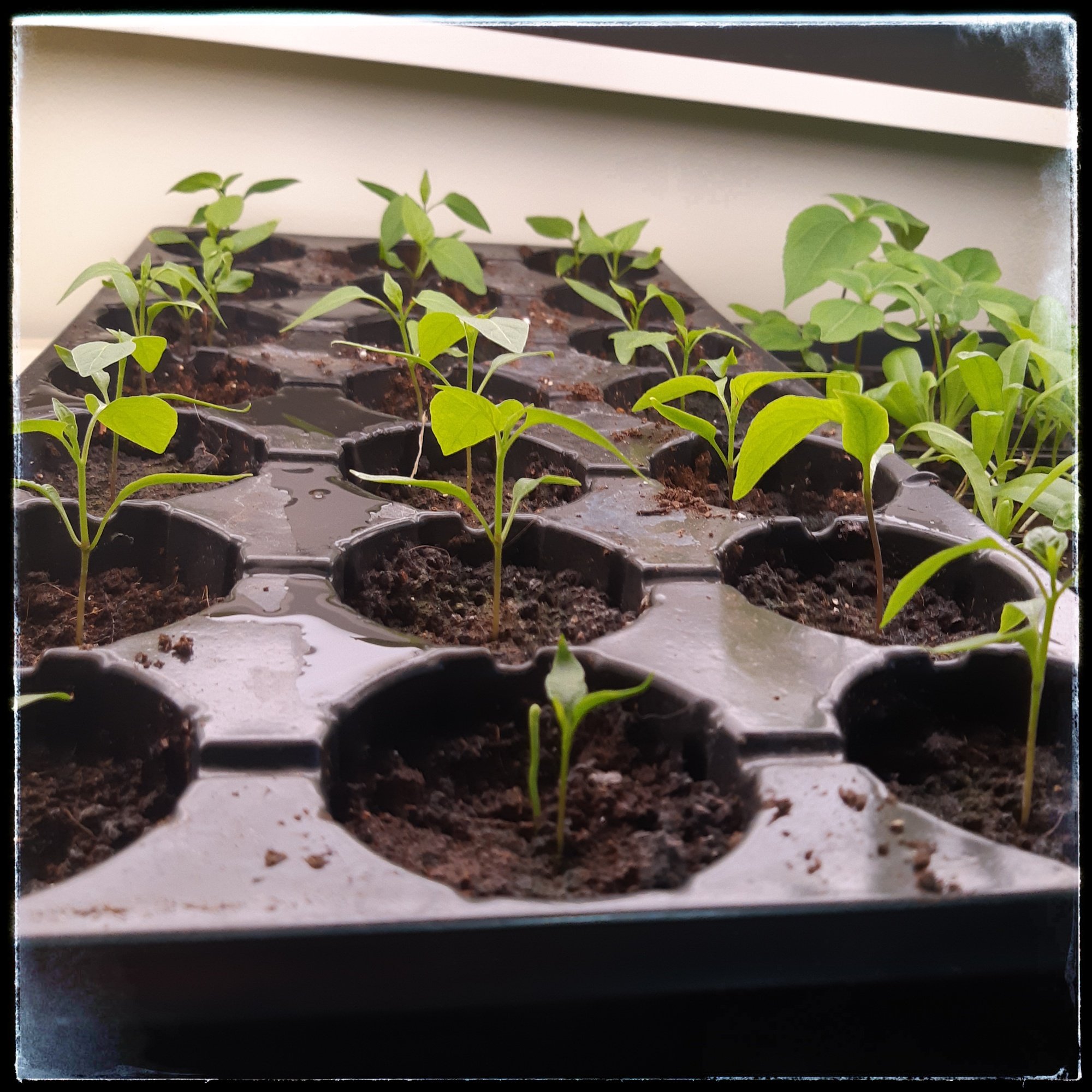 I started a few new things this year, this tray of Jalapeno peppers, started March 26:
