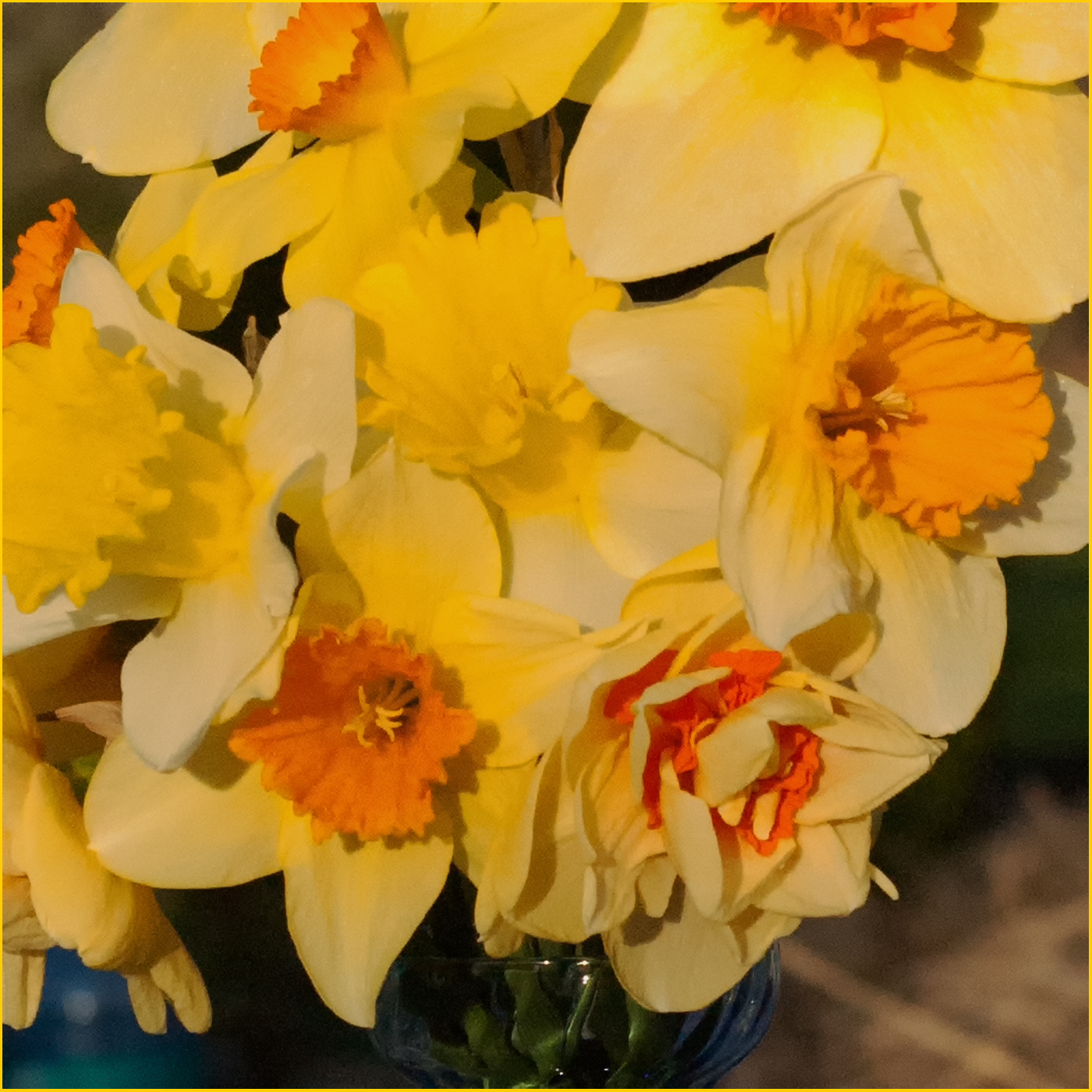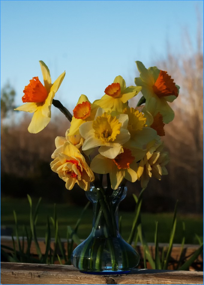 I’d say my garden is a day or two beyond peak daffodil season. Several varieties have almost faded away; several have started to fade away; several have just started to open and one is a few days from opening. I planted a new variety last fall (Tahiti – one of those just starting to open) and I wanted to showcase it, but I find myself underwhelmed with its frilliness. Instead, I added a few stems to a blue glass vase filled with other bi-coloured daffs. Some are short (like Tahiti) and one is just massive – name, unfortunately, unknown. I have a lot of them in clumps all over and I just love them.
