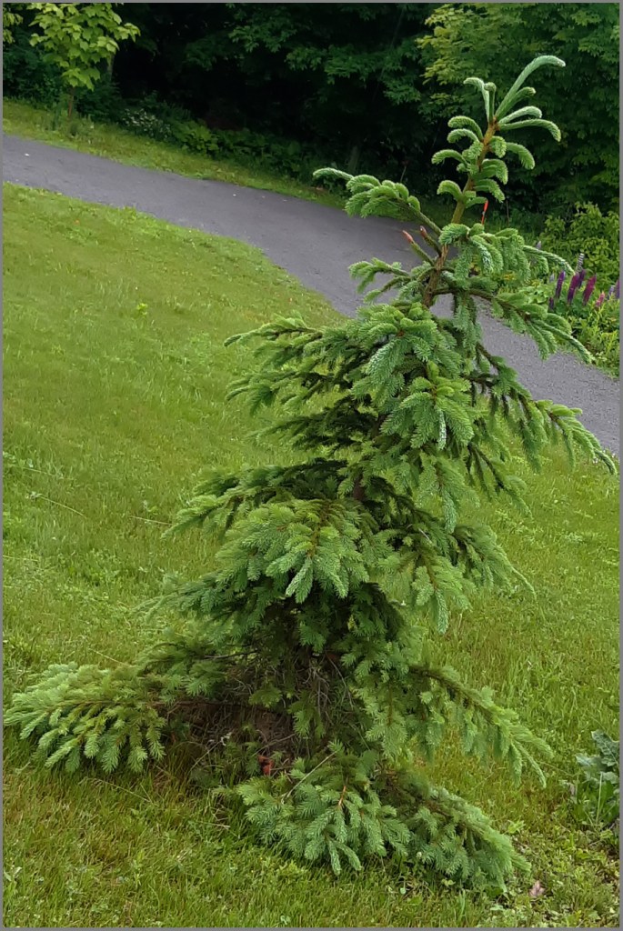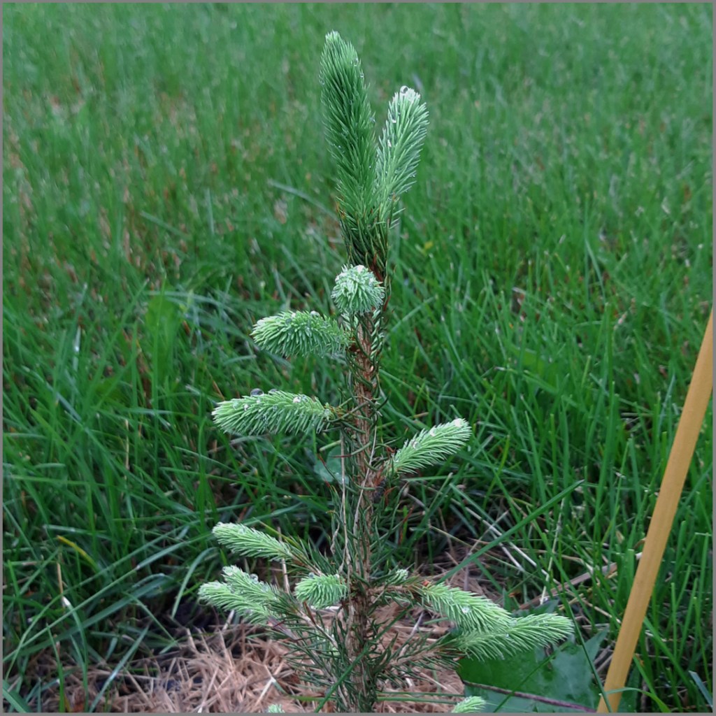 I think my current favourite evergreen, though, is this tiny white spruce – Picea glauca. The County was giving away various native tree saplings earlier this year, partly in an effort to mitigate the huge losses we’re seeing here from emerald ash borer. I have a dozen or so ash trees that are in various stages of dying/death and wanted to provide long term habitat for birds and so plunked this into the ground. It was just a fuzzy stick to begin with, but look at it now. Grow little tree, grow!