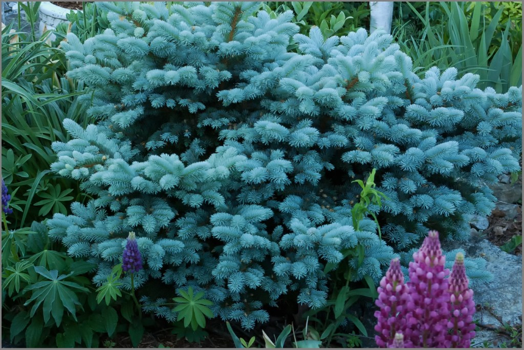 The most obvious candidate to highlight is the Colorado Blue Spruce, in all of its forms. I have a few trees but the one with the most shocking colour is the globe blue spruce – Picea pungens ‘Globosa.’ Every year the bright new candles shine out for many weeks until they age a bit, and seem to turn a bit dull. It makes a huge contrast to the various shades of green from the perennials springing up all around this little tree.
