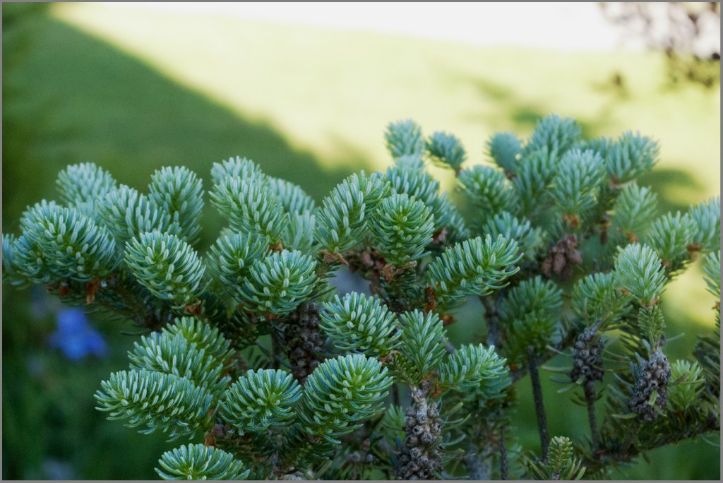 Another little fir tree with bright new needles, albeit not nearly as friendly looking, is the Korean fir – Abies koreana. It’s such a slow grower there’s barely an inch (2.5 cm) of new growth every year.