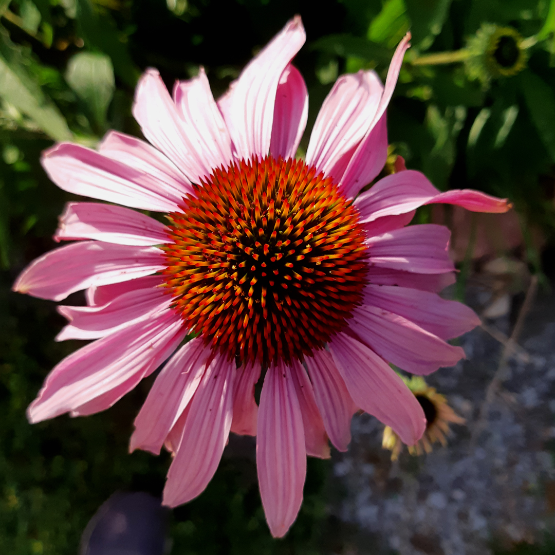 First – a few purple coneflowers. The ‘straight’ species, and one that’s had a cross of some sort – the leaves are narrower, the flower petals and cone both a bit different: